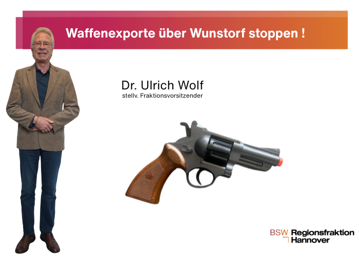 Ulrich Wolf (BSW): Waffenexporte über Wunstorf stoppen – falsches Signal zur falschen Zeit Angesichts des aktuellen Berichtes unter dem Titel „Panzertransport von Wunstorf in die Golfregion“ in der Hannoverschen Zeitung vom 30.3.2026 über regelmäßige Militärtransporte vom Fliegerhorst Wunstorf nach Katar übt Ulrich Wolf Kritik an den Abläufen und fordert umgehend