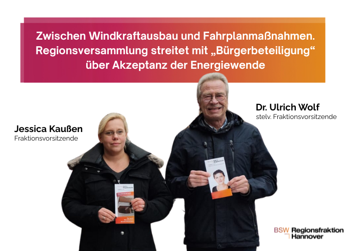 Die letzte Versammlung vor den Osterferien war von einem außerordentlichen hohen Interesse der Einwohner der Region geprägt. Dieses Interesse wurde vor allen Dingen von der Tatsache bestimmt, dass die Regionsversammlung die Ausweisung neuer Windkraftflächen auf der Tagesordnung hatte. Über hundert Einwohner, darunter viele Betroffene der von Umweltdezernent Palandt vorangetriebenen Ausweitung der Windkraftflächen, waren in der Versammlung anwesend. Die BSW Fraktion hatte im Vorfeld Kontakt mit Vertretern einer Bürgerinitiative aufgenommen, die die Ausbaupläne kritisch sieht. Entsprechend fragwürdig empfindet unsere Fraktion die nunmehr vorliegende Planung der Regionsverwaltung. In vielen Fällen müssen durch die Ausweisung der Ausbauflächen in Landschaftsschutzgebieten und durch die Höhe der neuen Anlagen (weit über 200 Meter) die Betroffenen nicht nur massive wirtschaftliche Verluste ihrer Immobilien in Kauf nehmen. Betroffene machen auch geltend, dass durch die von den Anlagen ausgelöste Beschattung und die Lärmemissionen die Menschen vor Ort auch gesundheitliche Belastungen befürchten.