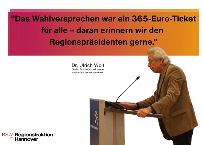 Die BSW-Regionsfraktion begrüßt ausdrücklich, dass das 365-Euro-Jobticket in der Region Hannover weiterhin ein Erfolgsmodell ist. Die jüngst veröffentlichte Pressemitteilung der