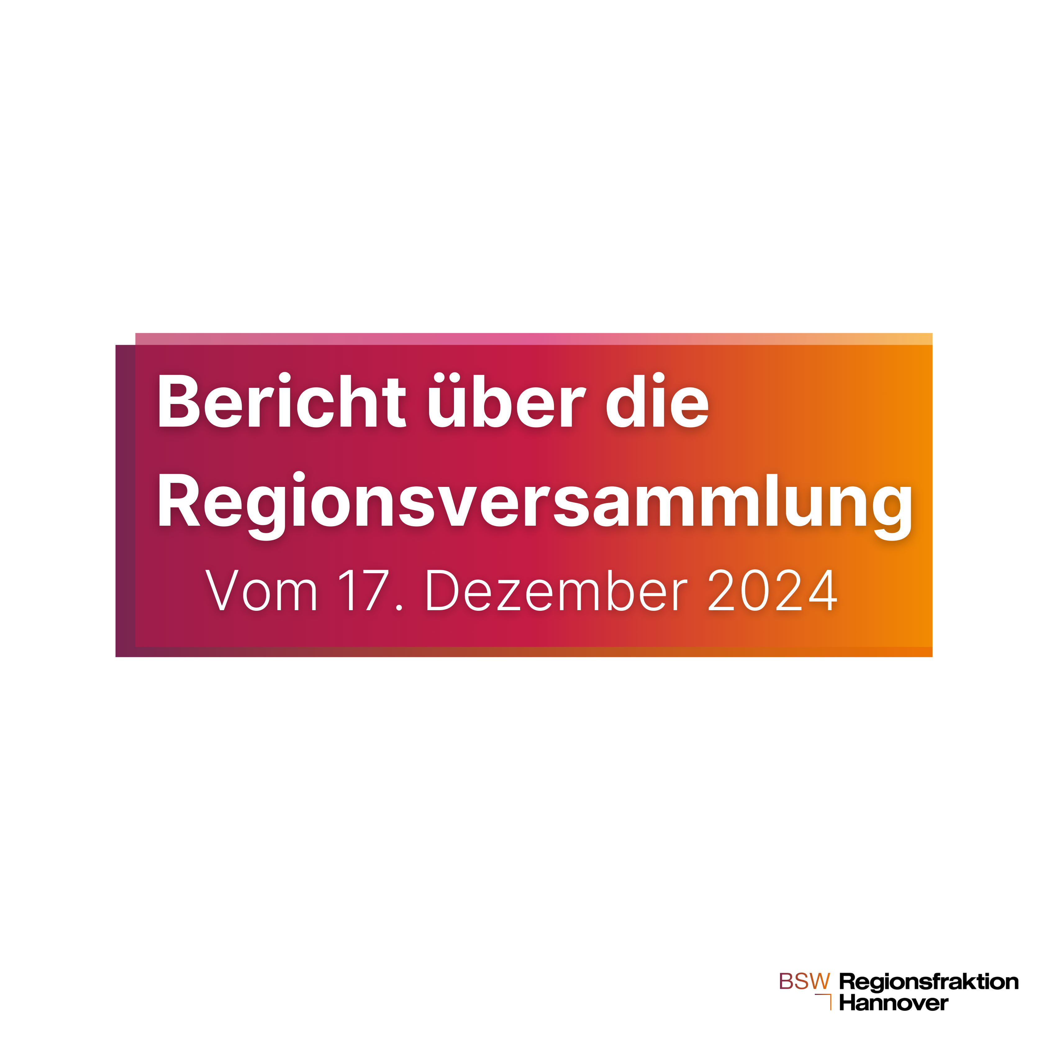 In der letzten Regionsversammlung des Jahres 2024 stand vor der Haushaltsdebatte zunächst das laufende Geschäft der Kommunalpolitik im Fokus der Debatte. Neben den unproblematischen Beschlussdrucksachen, die der Arbeit der laufenden Verwaltung dienen, gab es jedoch zum Jahresende auch Tagesordnungspunkte die kontrovers diskutiert wurden und zu Interventionen der BSW-Fraktion geführt haben.